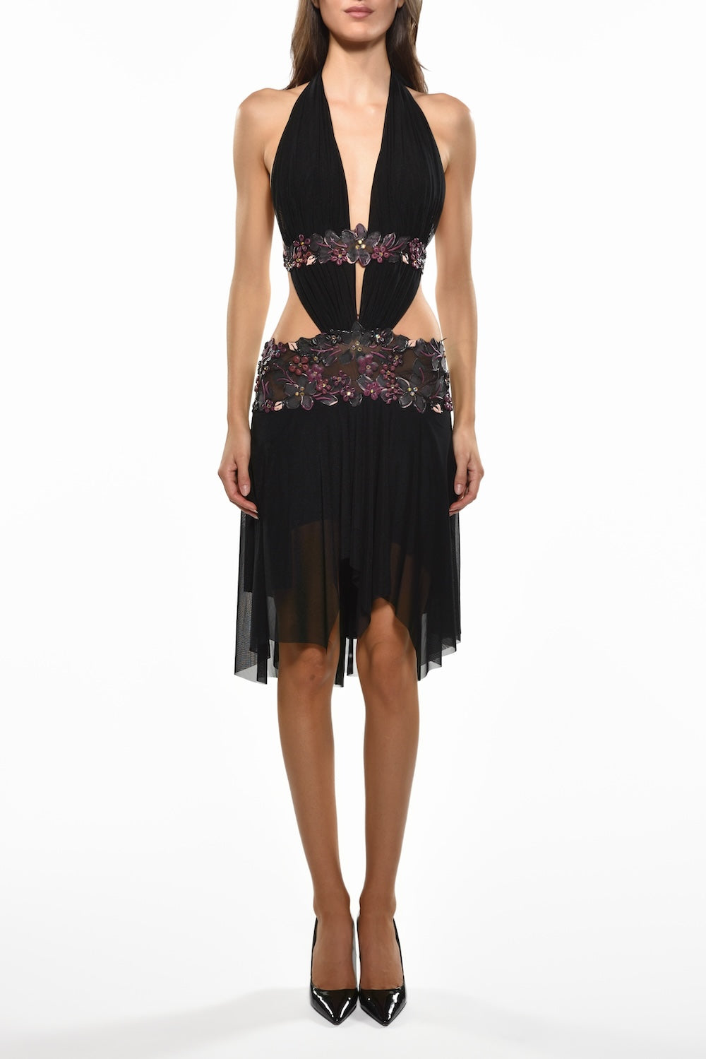Hand Painted in Black Combo English Garden Artwork, this halter tie back knee length dress features dimensional flowers in full bloom. The expertly crafted bodice contrasts beautifully with the fluid, flowing skirt, creating an etherial and striking silhouette.