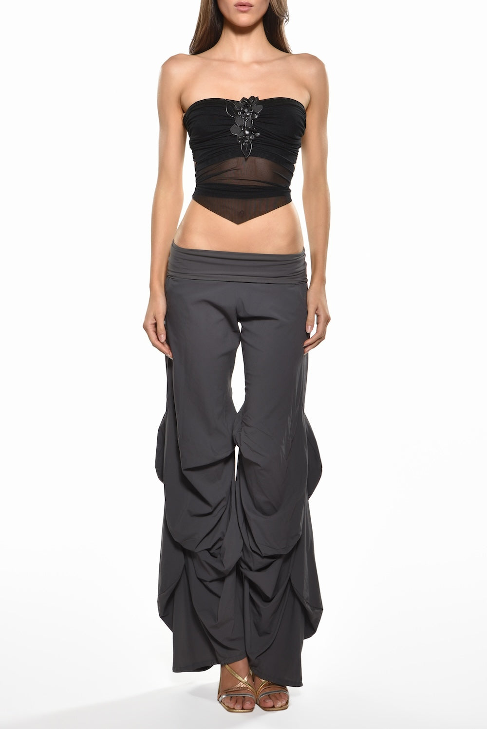 A timeless vintage recreation, meticulously crafted for the modern muse. This couture tie-back crop top features our signature English Garden artwork, hand-painted onto jet-black fabric and adorned with hand-placed jet-black crystals, creating an ethereal shimmer. Designed to sculpt and enhance, this piece blends romantic elegance with contemporary edge, offering a one-of-a-kind couture experience. Wearable art, made just for you—because true luxury is crafted, not mass-produced.