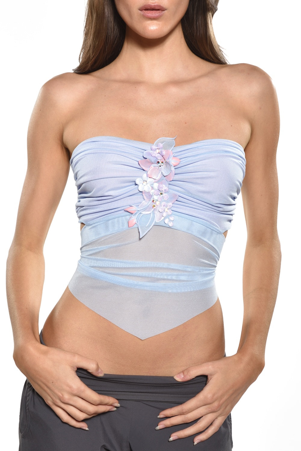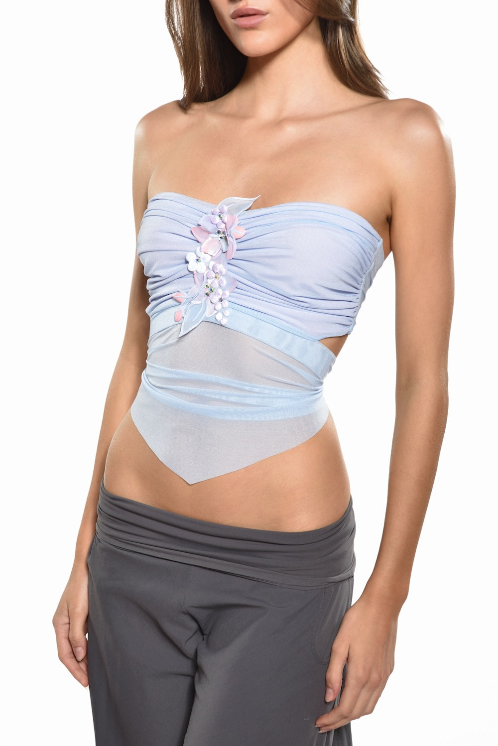 A timeless vintage recreation, meticulously crafted for the modern muse. This couture tie-back crop top features our signature English Garden artwork, hand-painted in delicate light blue hues and adorned with hand-placed crystals, creating an ethereal shimmer. Designed to sculpt and enhance, this piece blends romantic elegance with contemporary edge, offering a one-of-a-kind couture experience. Wearable art, made just for you—because true luxury is crafted, not mass-produced.