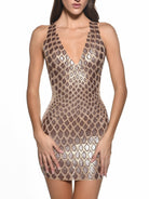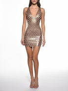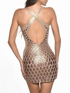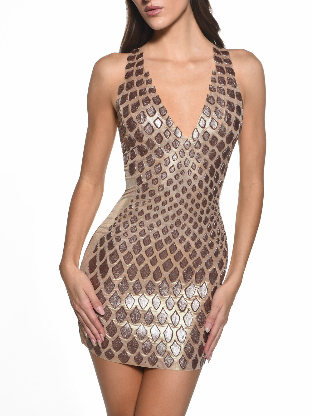 Sculpting V- Front Cross back Mini rendered in double sheer Gold four-way stretch mesh, adorned with Metallic Glossy hand-painted wearable art. Designed to contour the body with precision while remaining lightweight, fluid, and effortlessly versatile.
