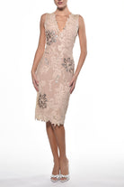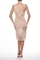 Hand-cut V Front V Back dress in nude mesh, painted in Nude Gold Botanica artwork. Soft, sculpting, and illuminated with golden botanical strokes.