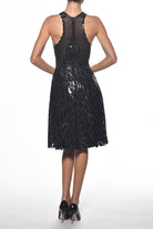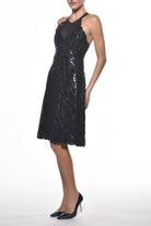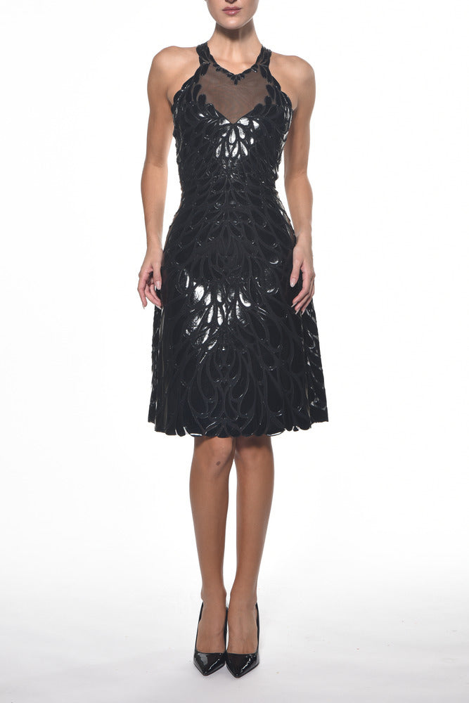 Black racerback dress painted in Black Glossy Folia artwork—leaflike strokes that sculpt and contour the silhouette with organic depth.