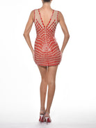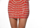 Hand-cut knee-length dress in nude four-way stretch mesh, hand-painted in our Red Glossy Crocodile artwork. Sculpting, striking, and built to highlight every curve with fiery contrast.