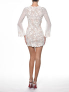 Hand-cut bat-sleeve knee-length dress in ivory four-way stretch mesh, painted in our Nude Ivory Combo English Garden artwork. Sculpting through the torso with fluid bat sleeves that move like soft petals around the arms.