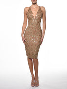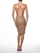Hand-cut knee-length dress in nude four-way stretch mesh, hand-painted in our Gold Glitter Tribal artwork. Sculpting, radiant, and adorned with golden tribal contours.