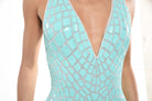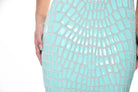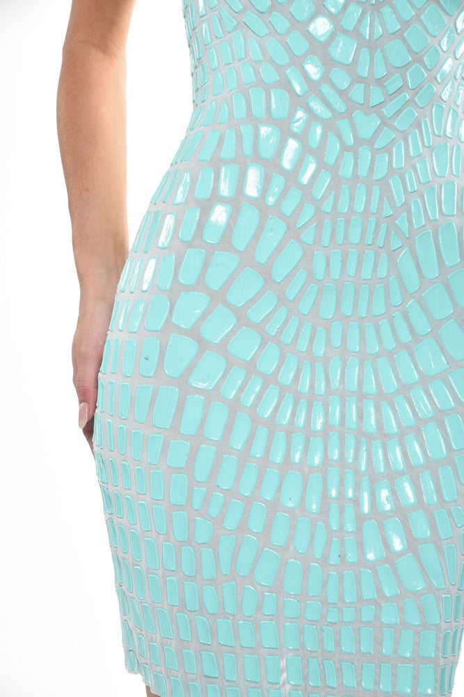 Hand-cut mid-length dress in Ivory four-way stretch mesh, hand-painted in our aqua croc artwork.