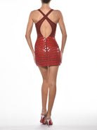 Hand-cut knee-length dress in Crimson four-way stretch mesh, hand-painted in our Red Glossy Crocodile artwork. Sculpting, fiery, and designed to shape the body with rich, high-gloss red contours.