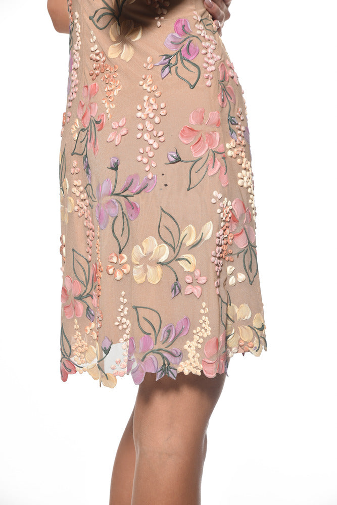 Hand-cut A-line racerback dress in nude four-way stretch mesh, painted in our Multicolor English Garden artwork. Sculpting at the bodice with a gentle A-line sweep, brought to life by raised Brush & Bottle botanical strokes that bloom across the body.