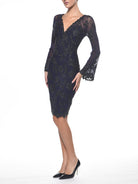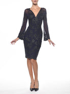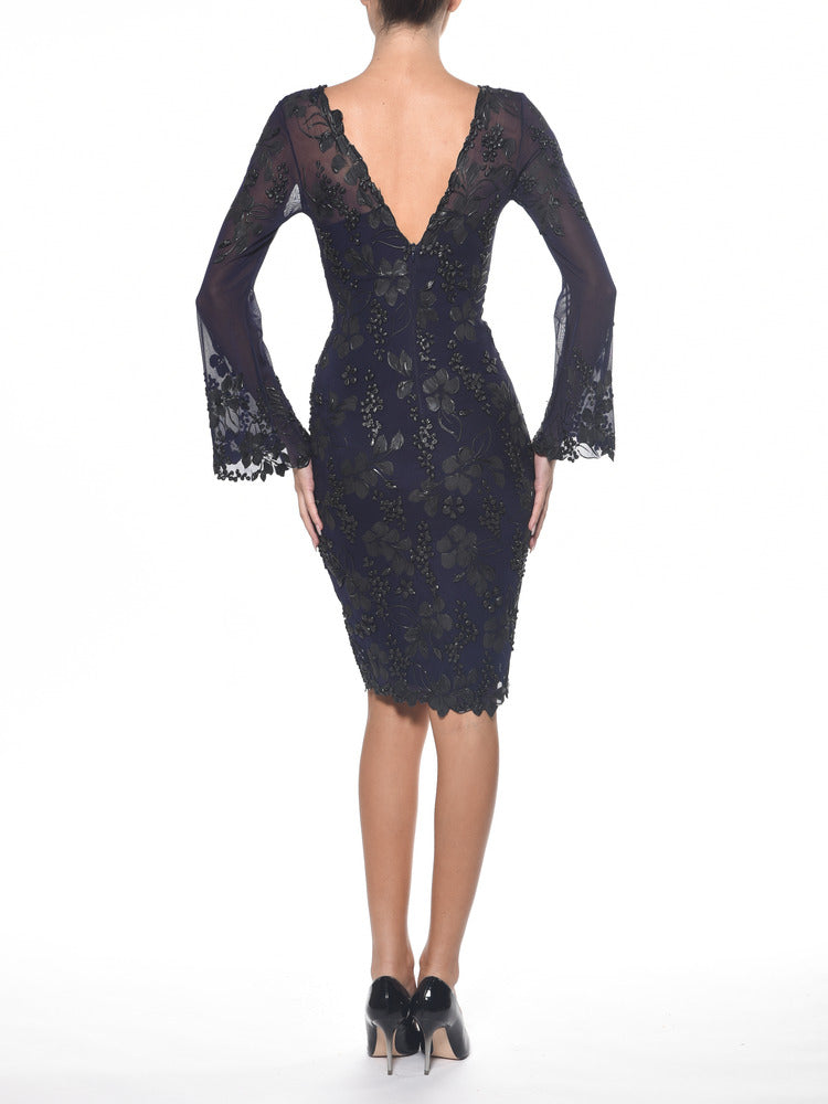 Hand-cut knee-length dress in Midnight Blue four-way stretch mesh, painted in our Black English Garden artwork with raised Brush & Bottle detailing. Sculpting, moody, and botanically dramatic.