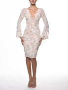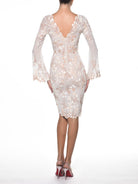Hand-cut bat-sleeve dress in Winter Melon four-way stretch mesh, painted in WM Pink Combo English Garden artwork. Sculpting through the torso with soft, wing-like bat sleeves and raised botanical strokes.