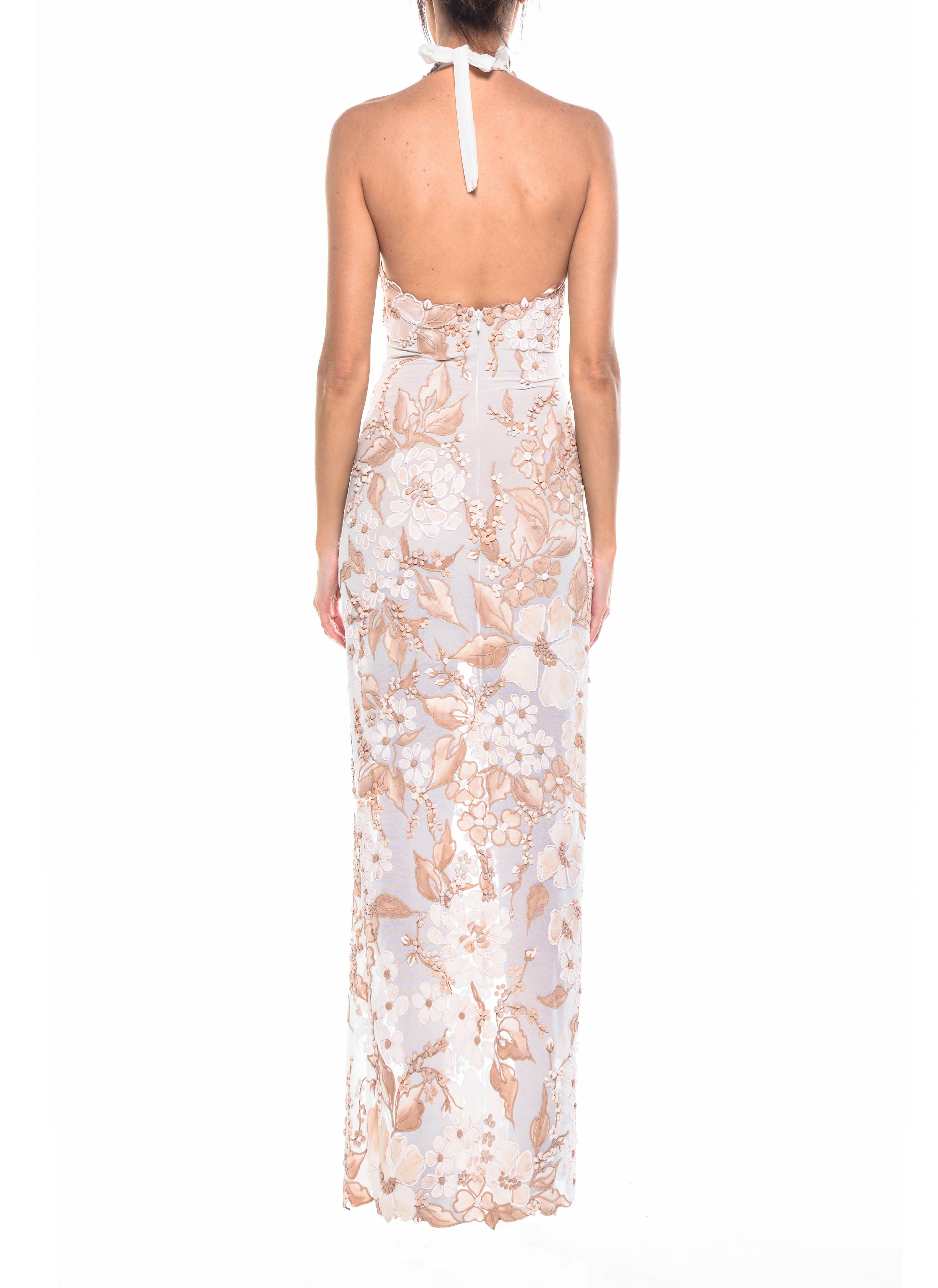 Floor length halter tie back princess slit dress on ivory sheer and lining