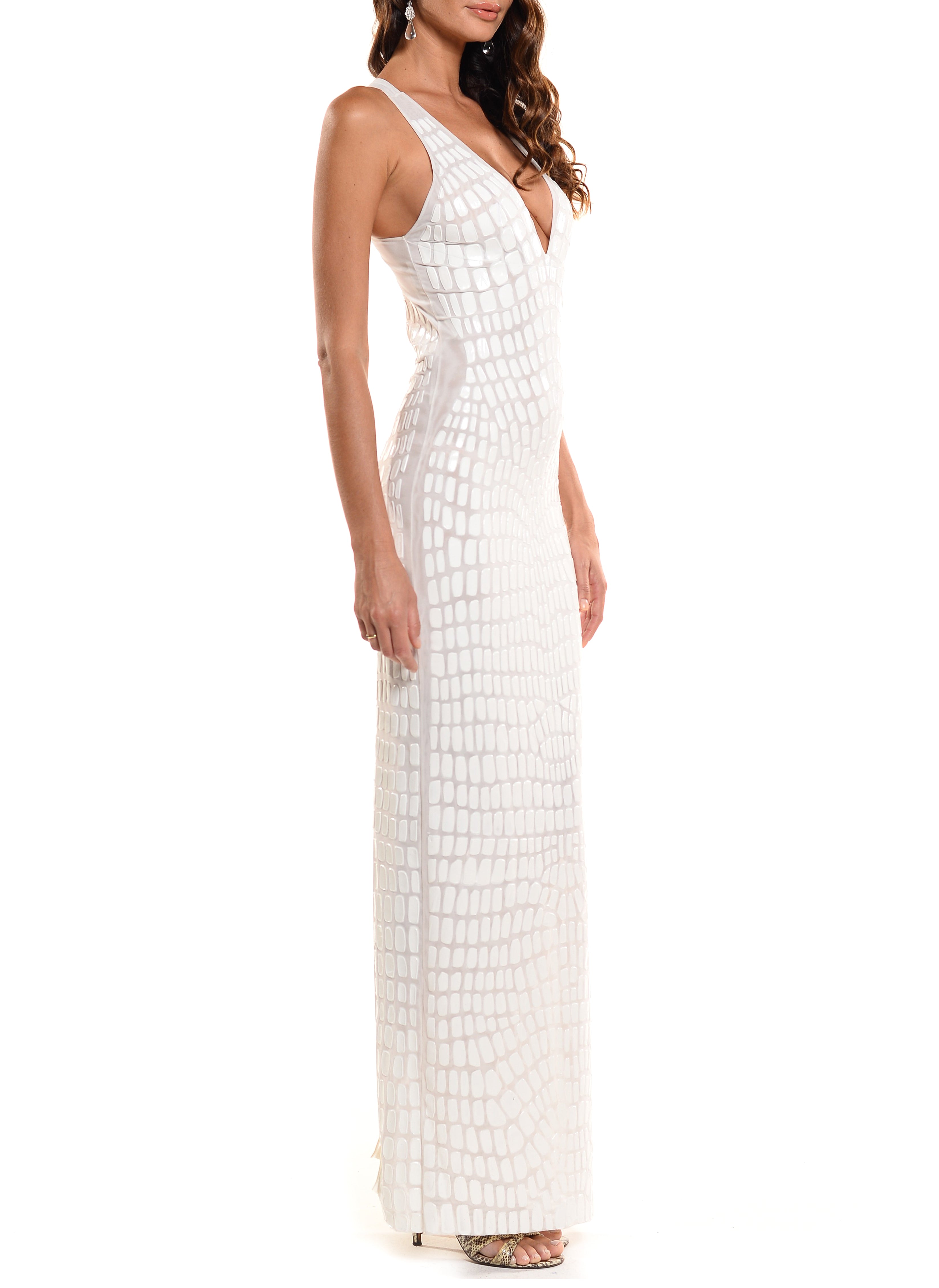 Floor length deep v-neck cross back gown on ivory sheer doubled.