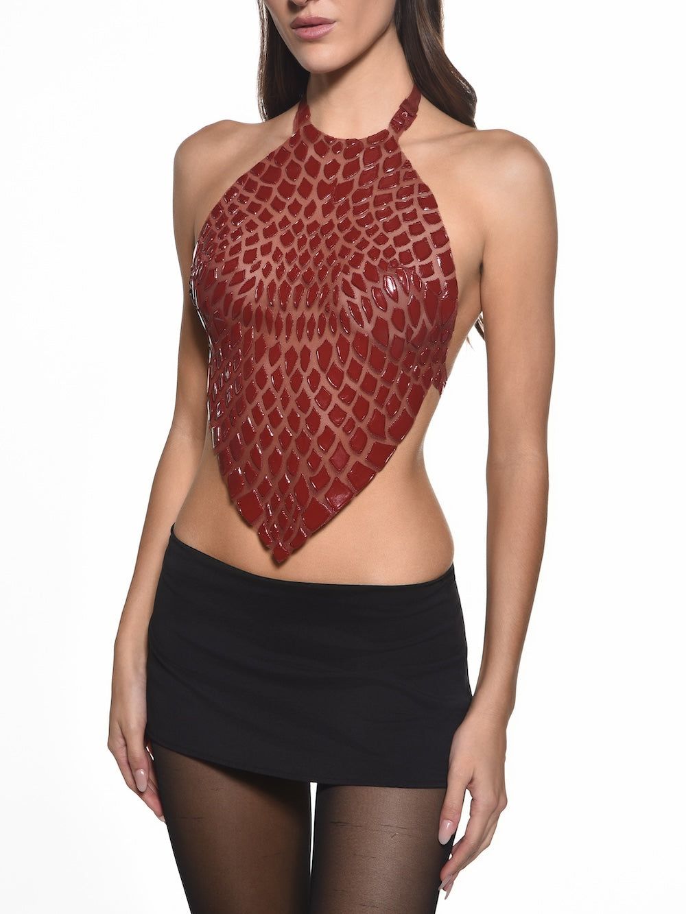 A sculpting crop top rendered in sheer red four-way stretch mesh - Lining on Bust, adorned with burgundy glossy hand-painted wearable art. Designed to contour the body with precision while remaining lightweight, fluid, and effortlessly versatile.