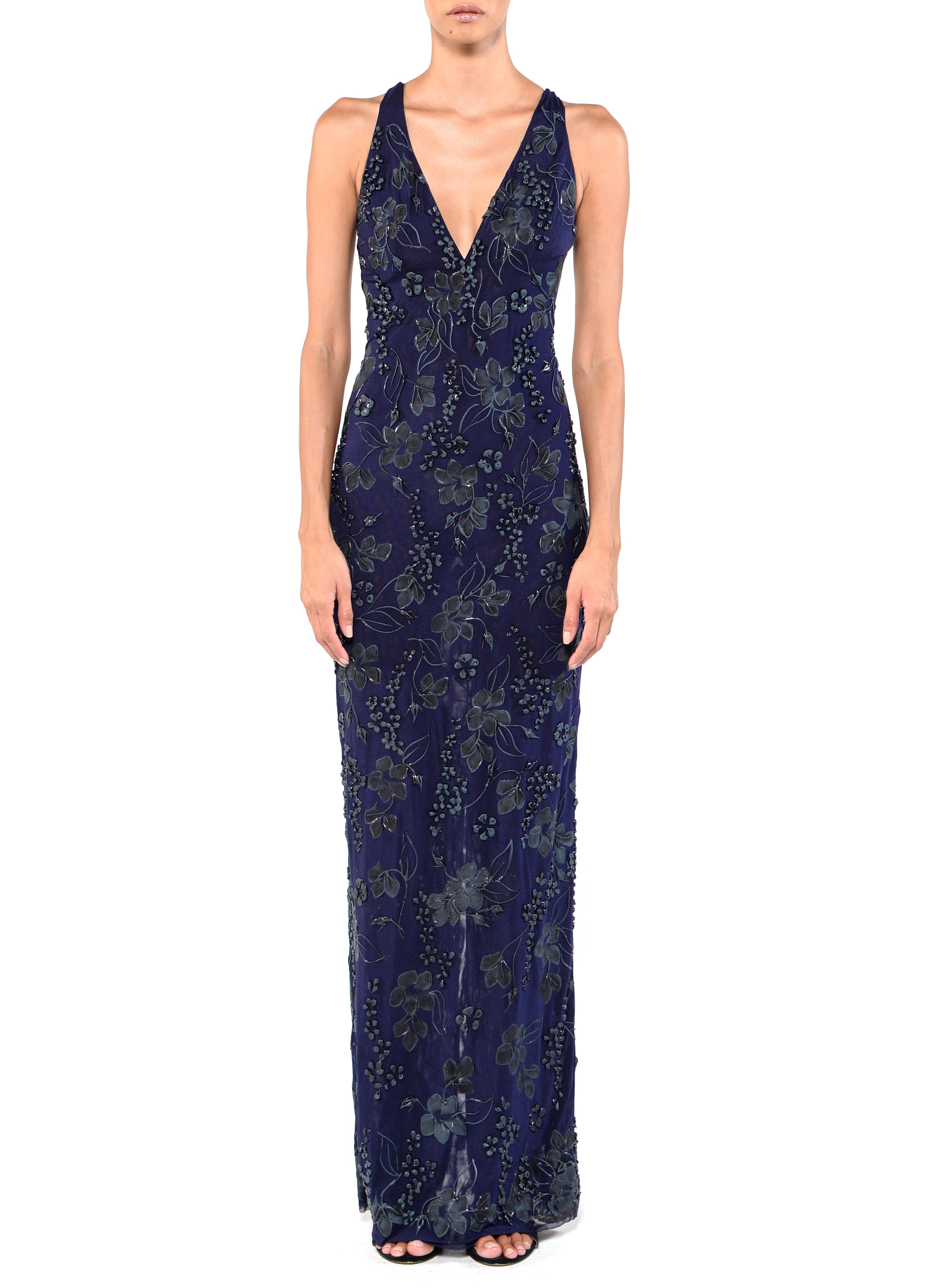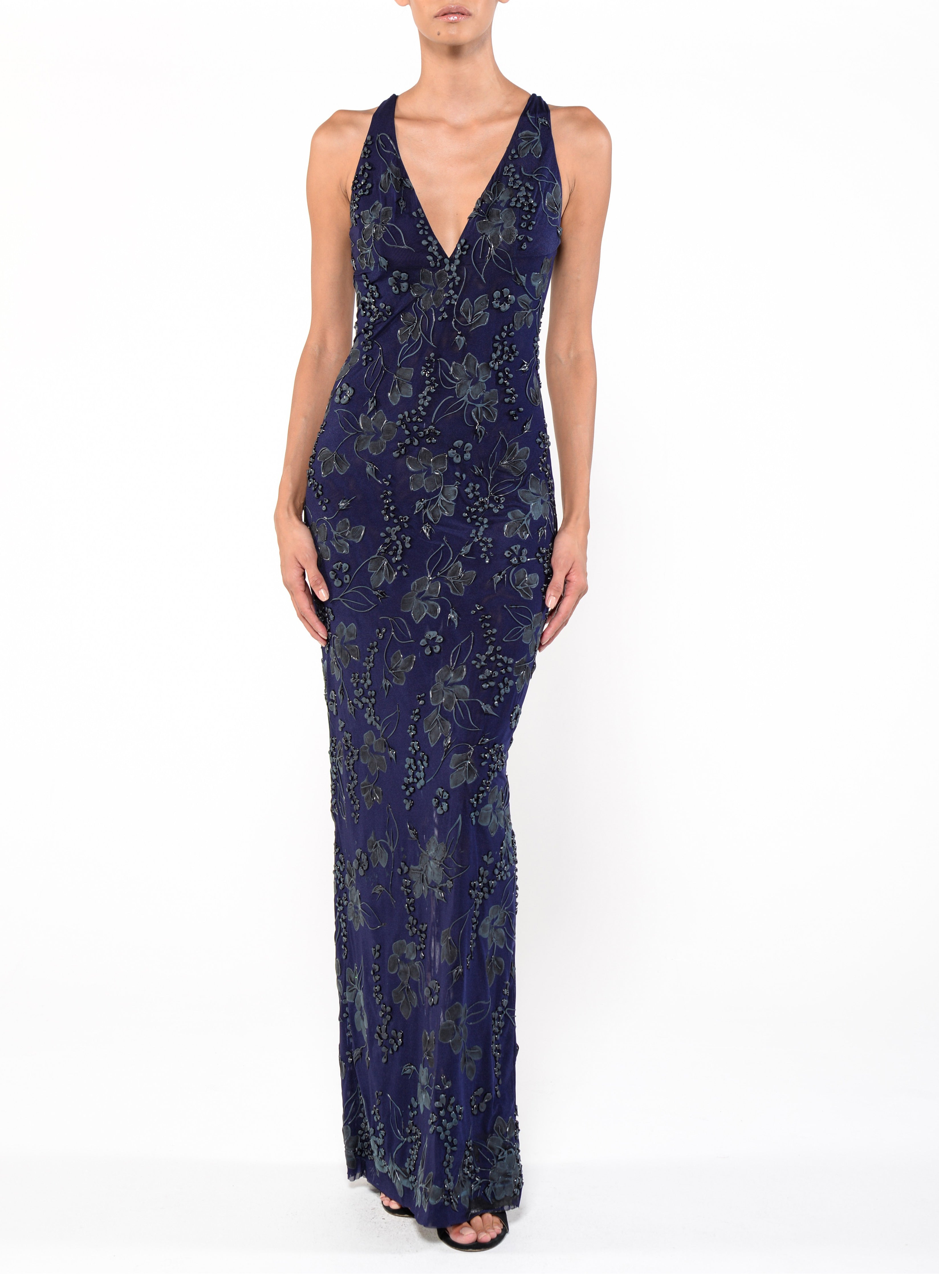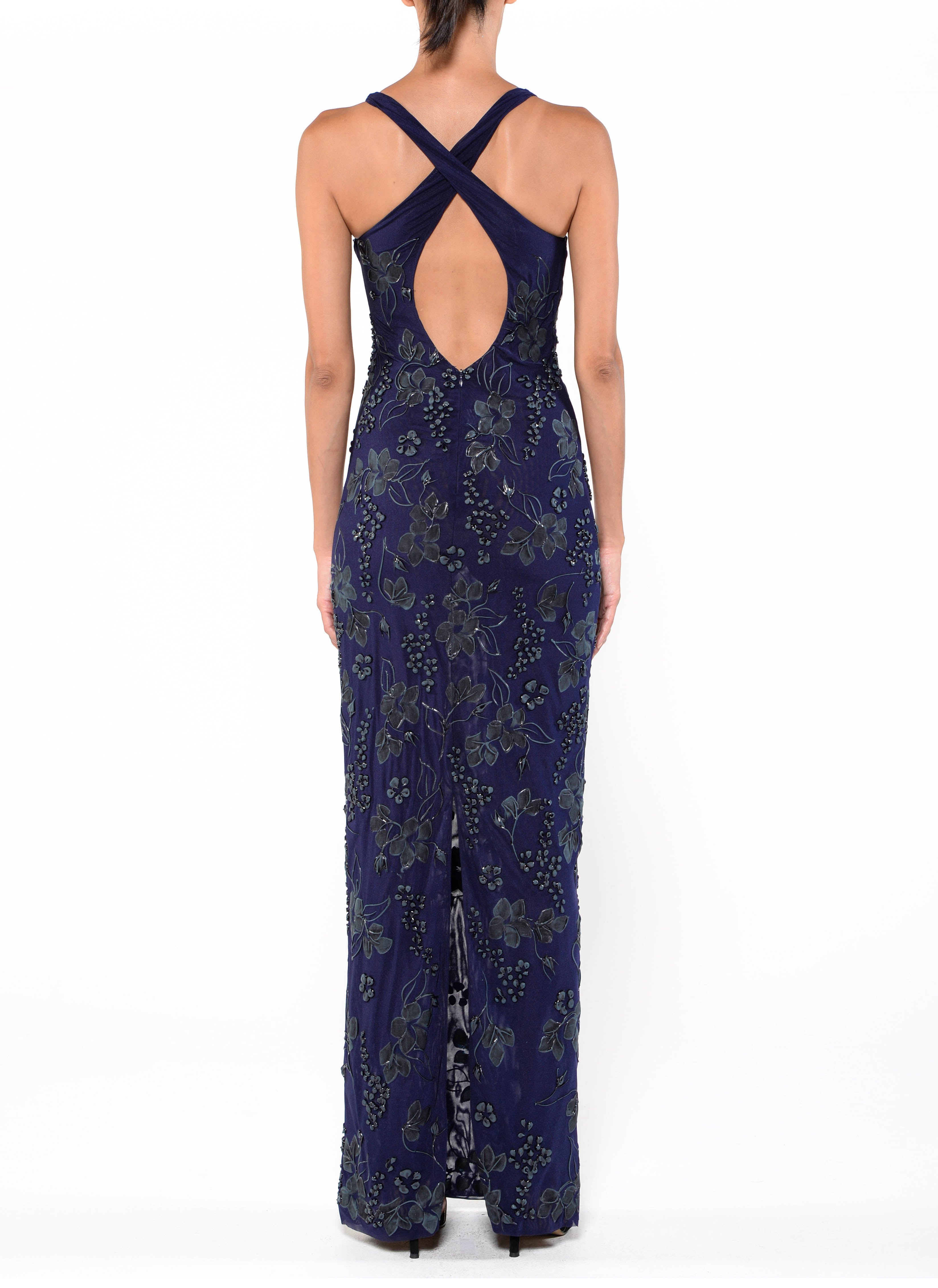 Floor length cross back gown with midnight blue shear and lining.
