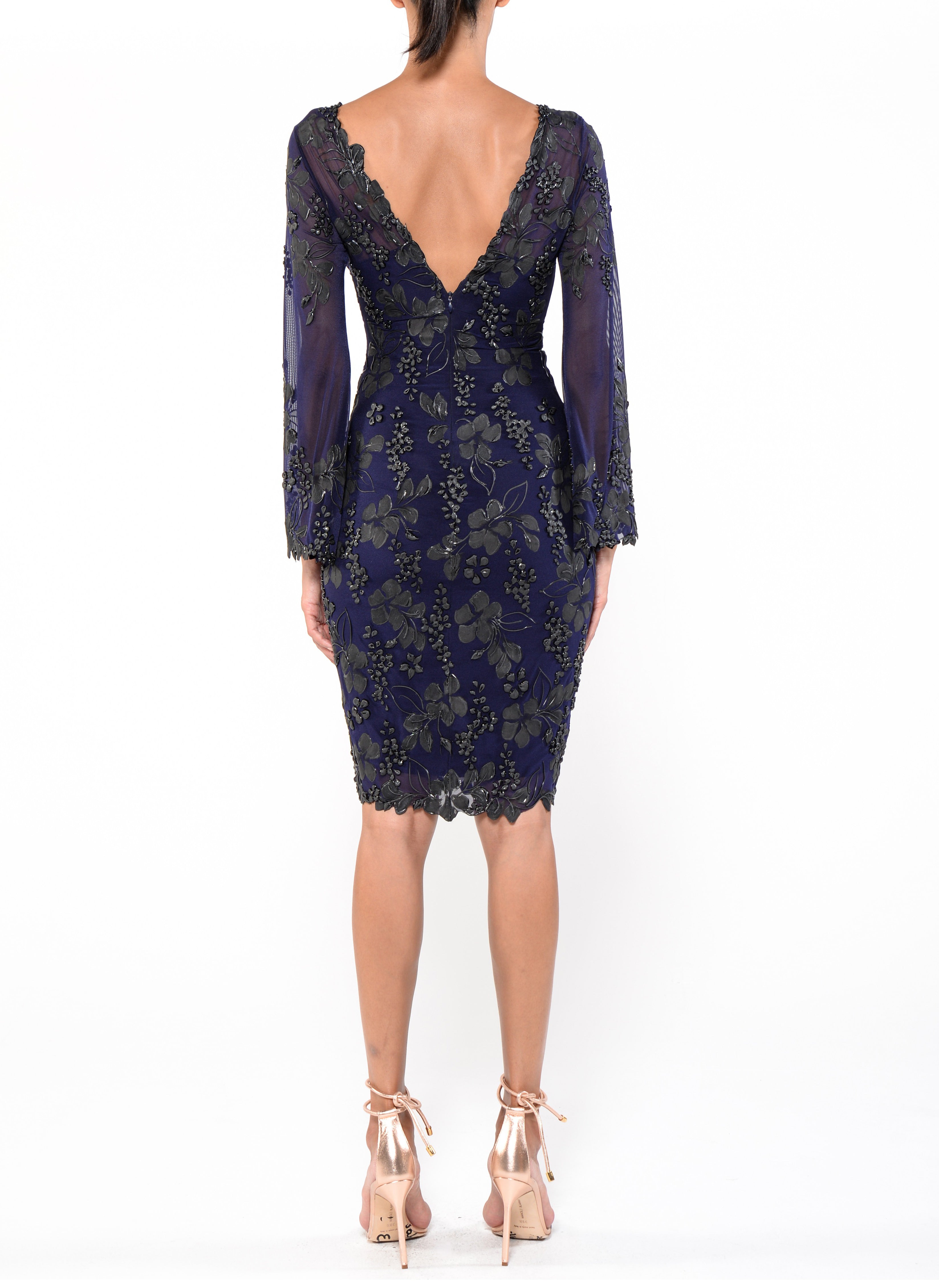 Knee length double v neck long sleeve dress on midnight blue sheer and black lining.