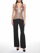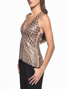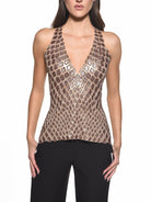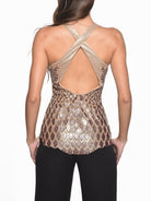 A sculpting V- Front Cross Back top rendered in sheer Gold four-way stretch mesh, adorned with Purple/Silver Metallic hand-painted wearable art. Designed to contour the body with precision while remaining lightweight, fluid, and effortlessly versatile.