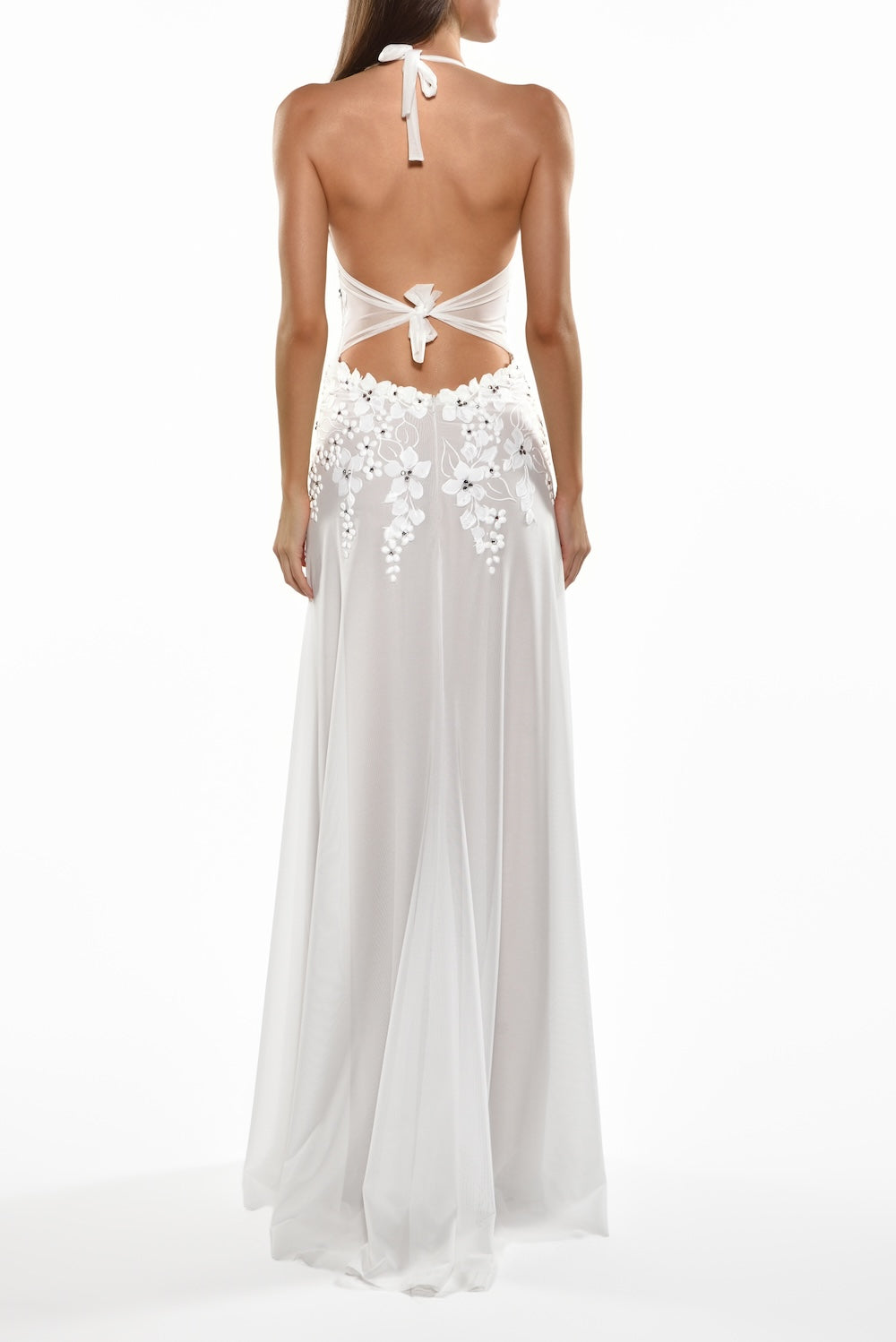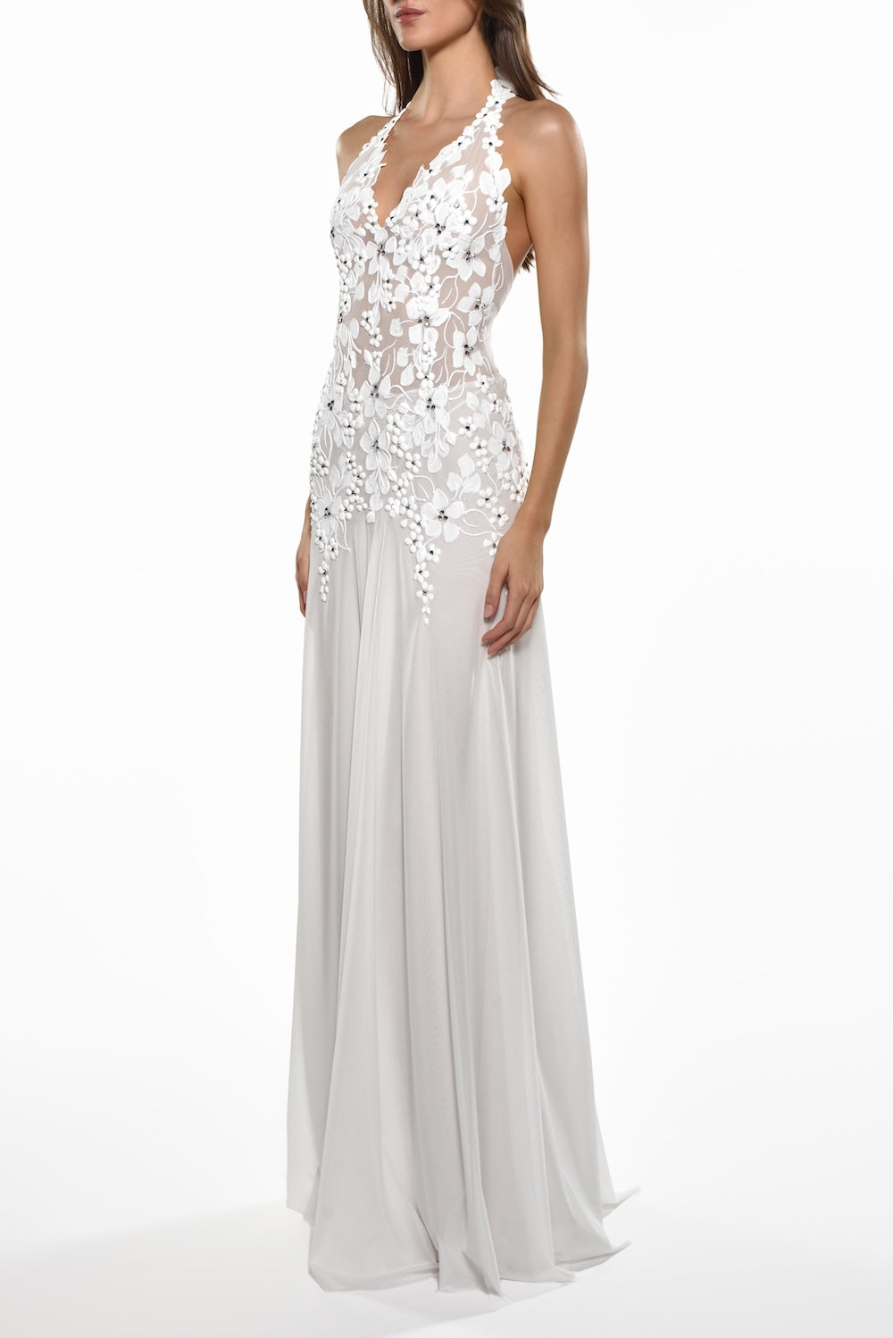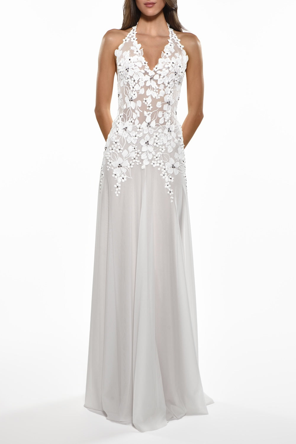 Hand-painted with white English Garden artwork, this floor-length halter double tie-back gown features dimensional design on lwhite sheer fabric & lining. The expertly crafted bodice accentuates the figure, while the flowing skirt cascades effortlessly, creating a dramatic and elegant silhouette. Perfect for evening affairs.