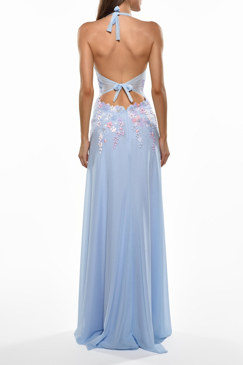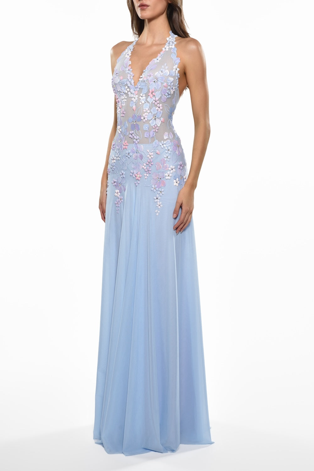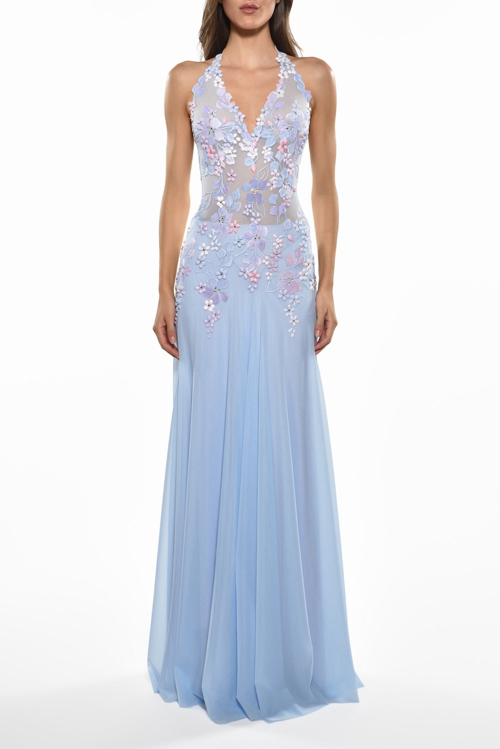 Hand-painted with light blue English Garden artwork, this floor-length halter double tie-back gown features dimensional design on light blue sheer fabric & lining. The expertly crafted bodice accentuates the figure, while the flowing skirt cascades effortlessly, creating a dramatic and elegant silhouette. Perfect for evening affairs.