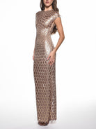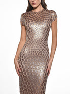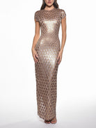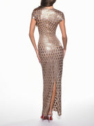 Sculpting Cap Sleeve Gown rendered in sheer Gold four-way stretch mesh with lining, adorned with Metallic hand-painted wearable art. Designed to contour the body with precision while remaining lightweight, fluid, and effortlessly versatile.
