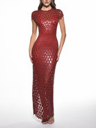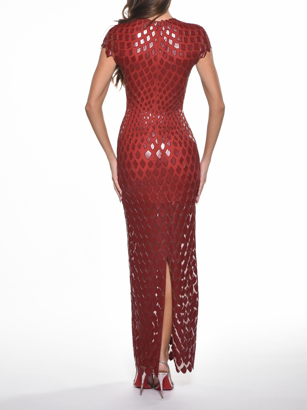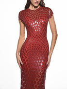 Sculpting Cap Sleeve Gown rendered in sheer Burgundy four-way stretch mesh with lining, adorned with Burgundy Glossy hand-painted wearable art. Designed to contour the body with precision while remaining lightweight, fluid, and effortlessly versatile.