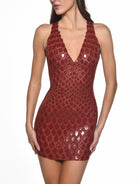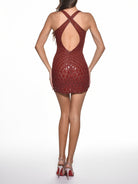 Sculpting V- Front Cross back Mini rendered in double sheer Burgundy four-way stretch mesh, adorned with Burgundy Glossy hand-painted wearable art. Designed to contour the body with precision while remaining lightweight, fluid, and effortlessly versatile.