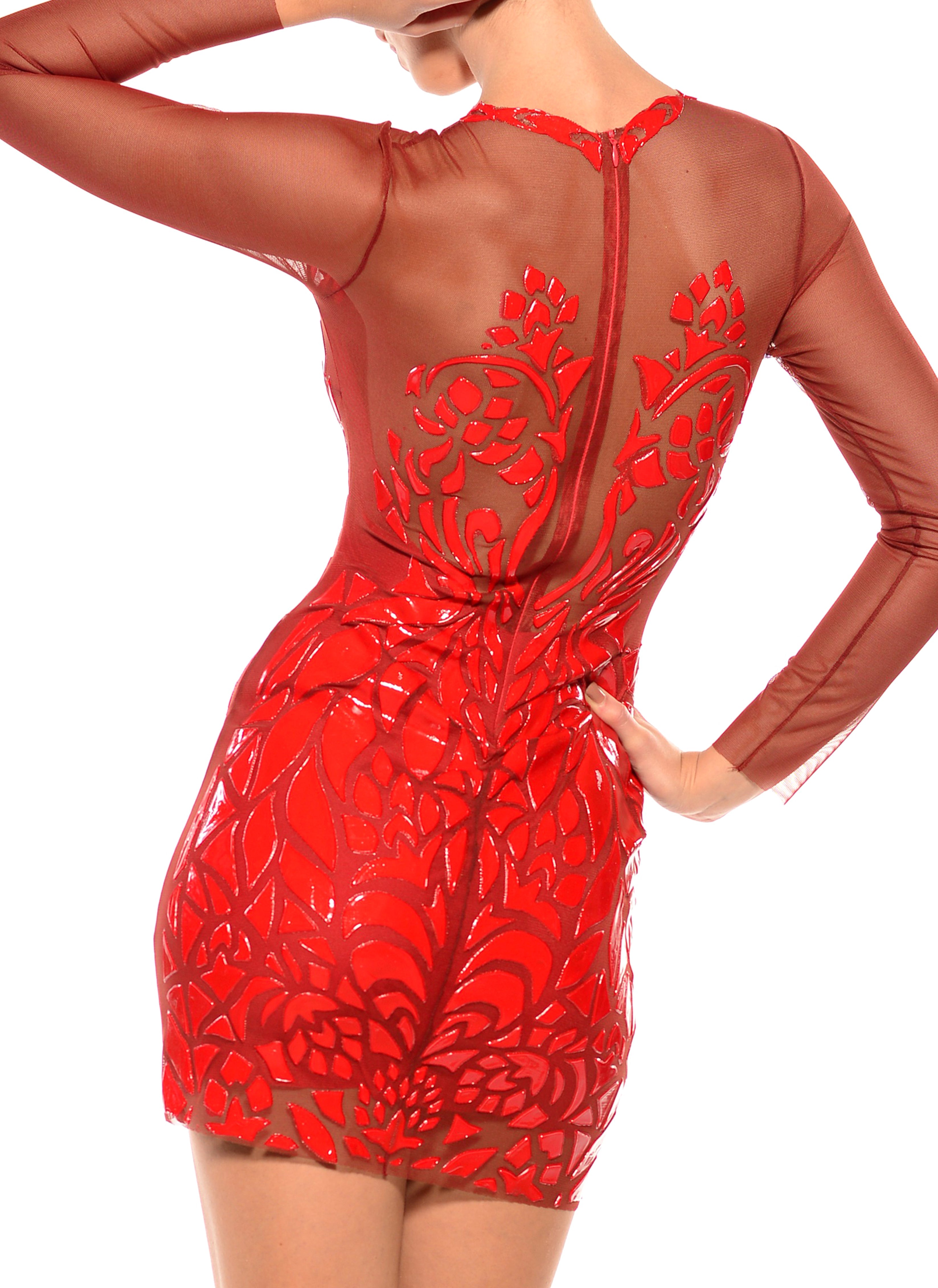 Mini length jewel neck long sleeve dress on crimson sheer with red lining.