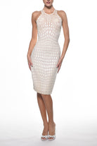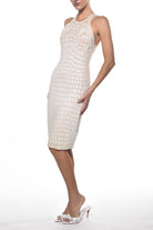 Sculpting racerback dress in white mesh painted with shimmering White Glitter Sobek artwork—reptilian-inspired strokes with a gleaming, ethereal effect.