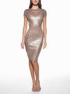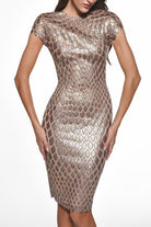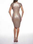 Sculpting Cap Sleeve Knee Length rendered in sheer Gold four-way stretch mesh with lining, adorned with Metallic hand-painted wearable art. Designed to contour the body with precision while remaining lightweight, fluid, and effortlessly versatile.