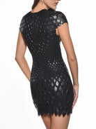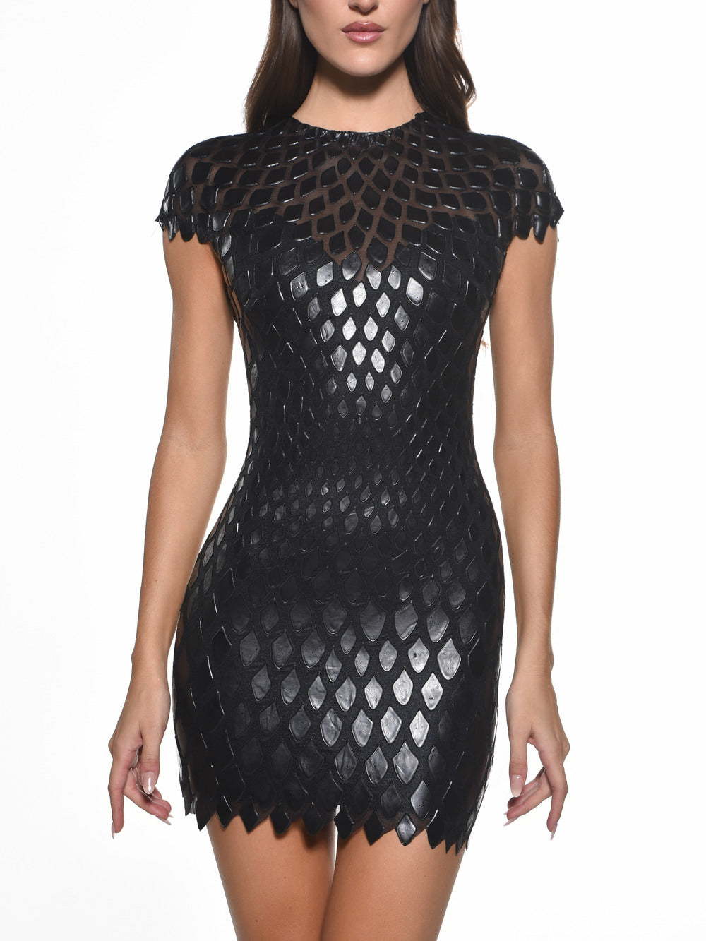 Sculpting Cap Sleeve Mini rendered in sheer Black four-way stretch mesh with lining, adorned with Black Glossy hand-painted wearable art. Designed to contour the body with precision while remaining lightweight, fluid, and effortlessly versatile.