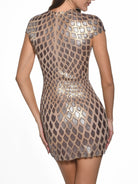 Sculpting Cap Sleeve Mini rendered in sheer Gold four-way stretch mesh with lining, adorned with Metallic Glossy hand-painted wearable art. Designed to contour the body with precision while remaining lightweight, fluid, and effortlessly versatile.