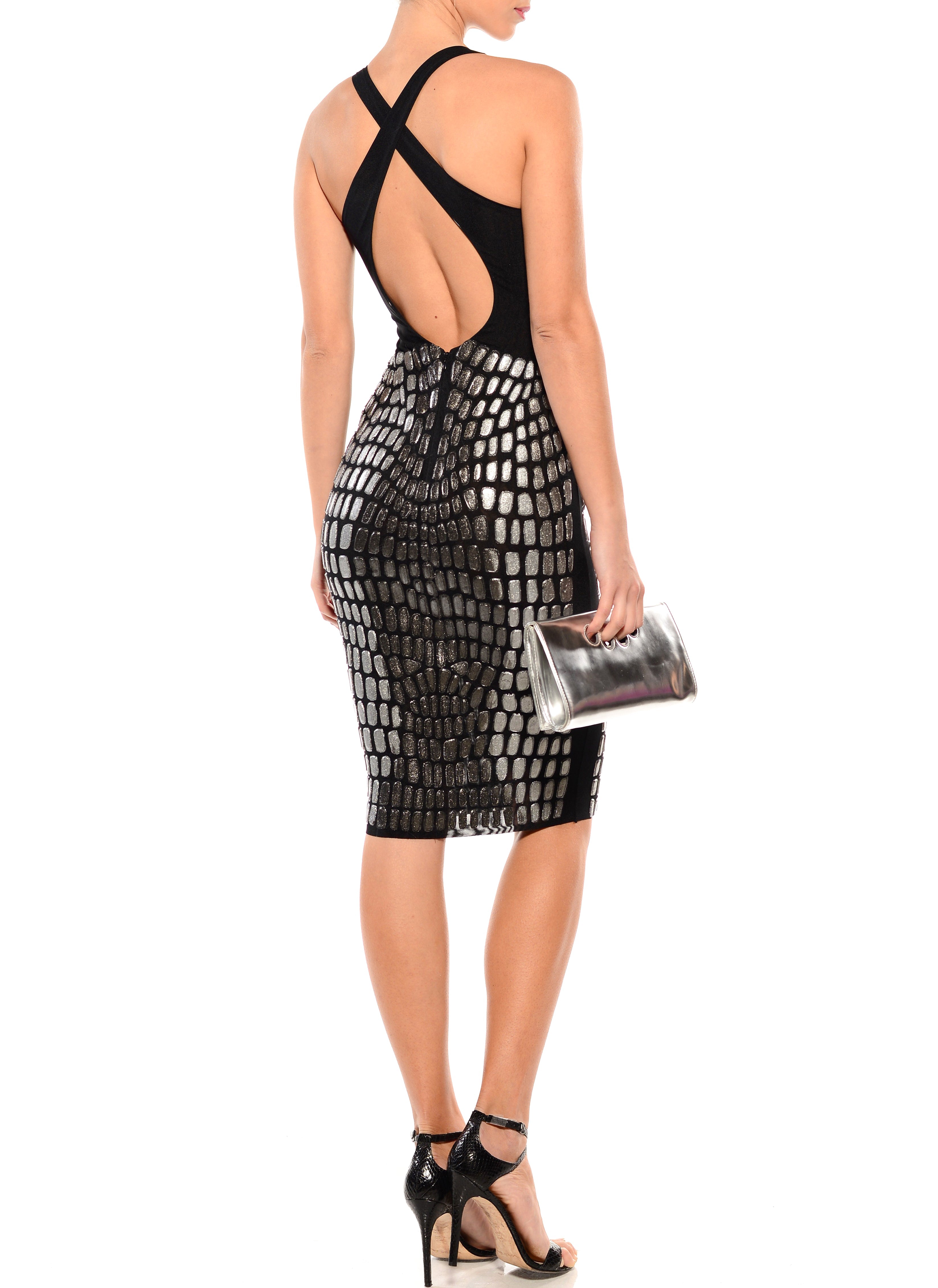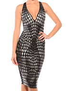 Knee length deep v-neck cross back dress on black sheer doubled.