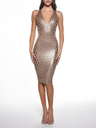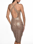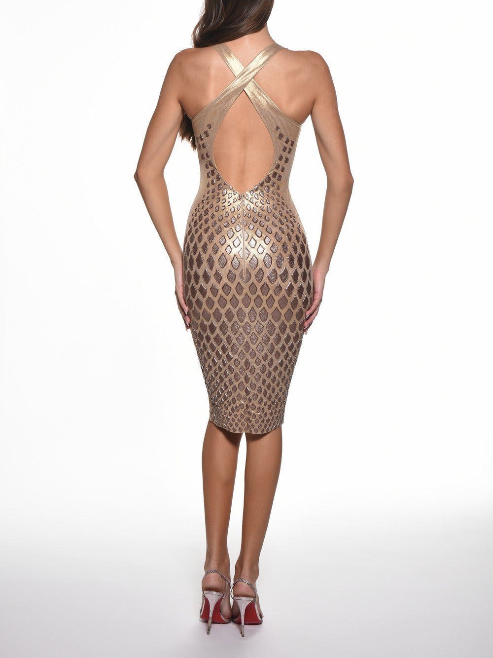 Sculpting V- Front Cross back Knee Length rendered in double sheer Gold four-way stretch mesh, adorned with Metallic Glossy hand-painted wearable art. Designed to contour the body with precision while remaining lightweight, fluid, and effortlessly versatile.
