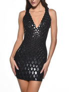Sculpting V- Front Cross back Mini rendered in double sheer Black four-way stretch mesh, adorned with Black Glossy hand-painted wearable art. Designed to contour the body with precision while remaining lightweight, fluid, and effortlessly versatile.
