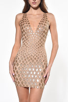 Sculpting V- Front Cross back Mini rendered in double sheer Nude four-way stretch mesh, adorned with Metallic Gold hand-painted wearable art. Designed to contour the body with precision while remaining lightweight, fluid, and effortlessly versatile.
